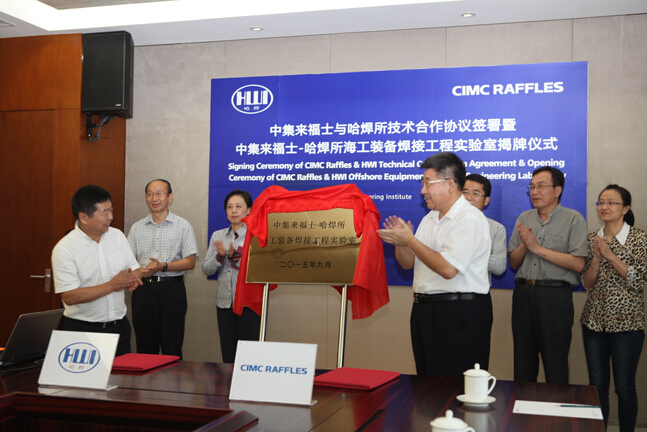 參觀后,雙方進(jìn)行了深入的交流洽談,針對(duì)煙臺(tái)中集來(lái)福士的技術(shù)亟需,雙方經(jīng)篩選初步擬定了兩個(gè)第一期合作課題,確定項(xiàng)目組成員編寫計(jì)劃任務(wù)書,計(jì)劃組織申報(bào)省市科技攻關(guān)項(xiàng)目。隨后舉行了煙臺(tái)中集來(lái)福士海洋工程有限公司與哈爾濱焊接研究所共建的